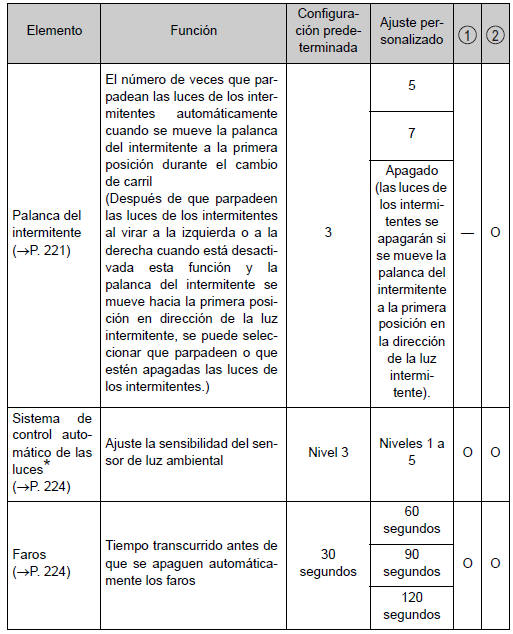 Algunos ajustes de las funciones se cambian de forma simultánea con otras funciones que se pueden personalizar. Para obtener más información, póngase en contacto con un concesionario Toyota autorizado, con cualquier taller, o con otro profesional con la cualificación y el equipo necesarios.